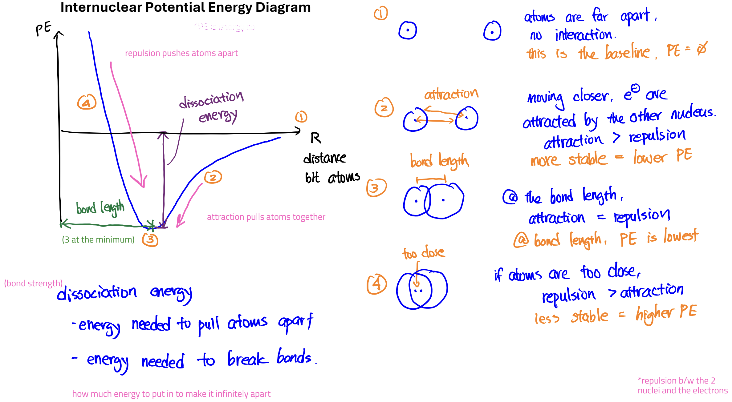 Larger bond dissociation energy (deeper well) means stronger bond (lower energy/more stable)