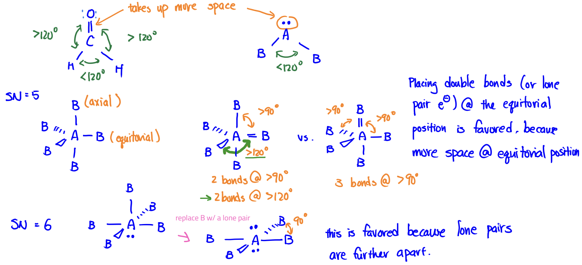 Due to repulsions, lone pairs and double bonds take up more space than single bonds and distort the geometry of the molecules.