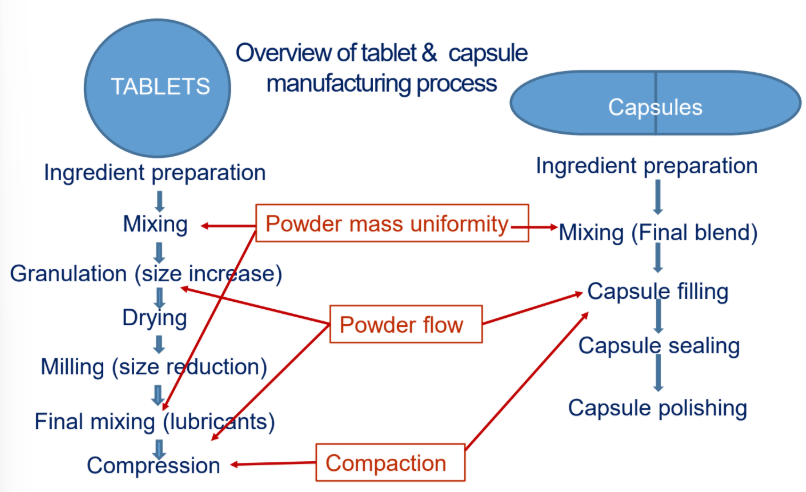 useful in solid handling —> determining appropriate size containers, mixing vessels, capsule size