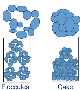 Flocculated suspensions settle faster but form a loose, easily redispersible sediment, unlike cakes, which are hard and difficult to redisperse.
