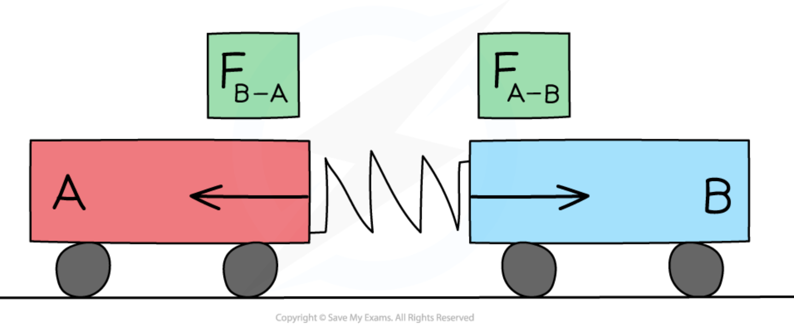 Symbol representation of the fact that the force of Trolley A on Trolley B is equal and opposite to the force of Trolley B on Trolley A when the two trolleys collide: