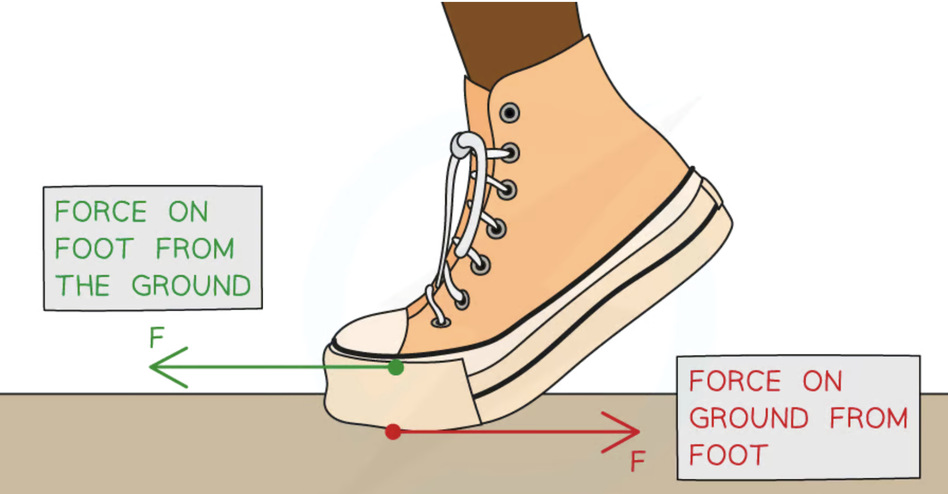 Foot pushes ground backwards and ground pushes foot forwards