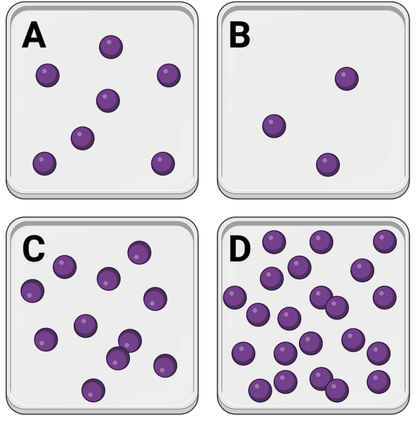 The figure shows an initial distribution of molecules (purple dots) dissolved in a beaker of water. Beakers A through D show four potential distributions of the molecules after some time.