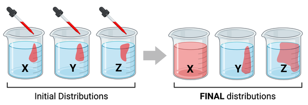 The figure shows the same amount of red liquid being added to each of three beakers of water (see initial distributions). The molecular mass of the molecules in the red liquid differs among beakers. After 10 minutes, you notice that the red liquid has diffused at a different rate in each beaker (see final distributions).