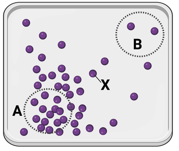 The figure shows a container in which a set of identical molecules (purple dots) are diffusing. Two areas of equal size are designated by dashed lines (area A and area B). The molecule labeled as X is the same distance from area A and from area B.