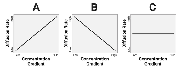The figure below presents three graphs. Each graph below shows a relationship between the concentration gradient of a solute and the rate of diffusion in a solution.