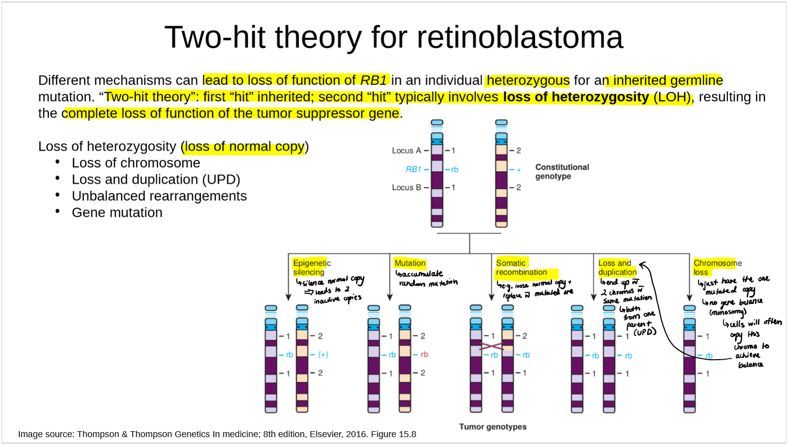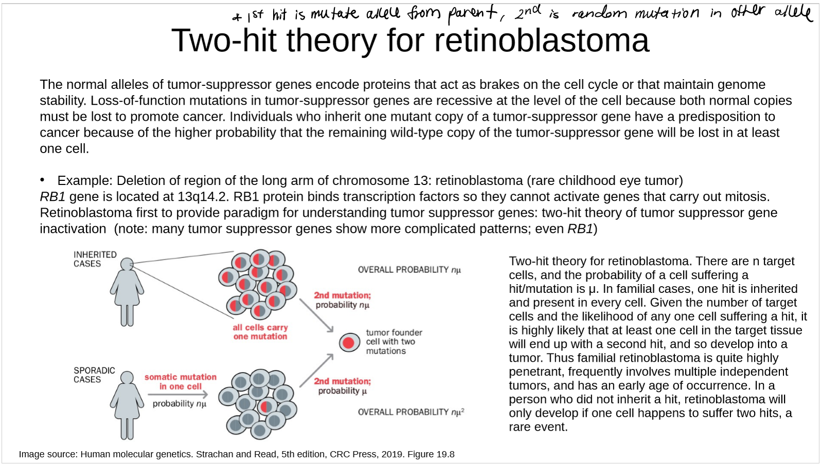 One mutated allele of a tumor suppressor gene does not directly cause cancer, but it increases the risk of developing cancer → need mutations in both alleles to cause cancer