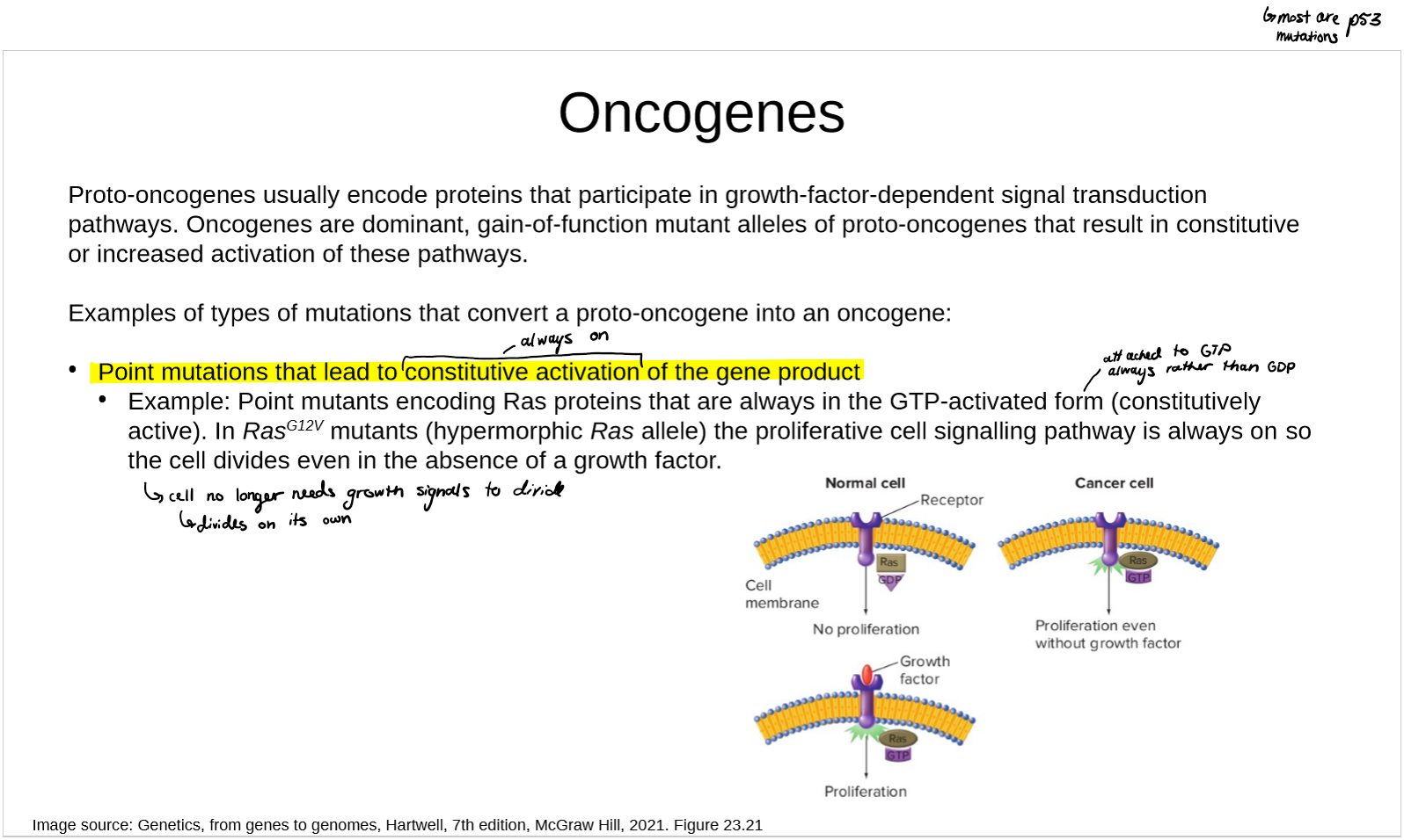 Oncogenic mutation is a gain-of-function mutation → either more function or new function