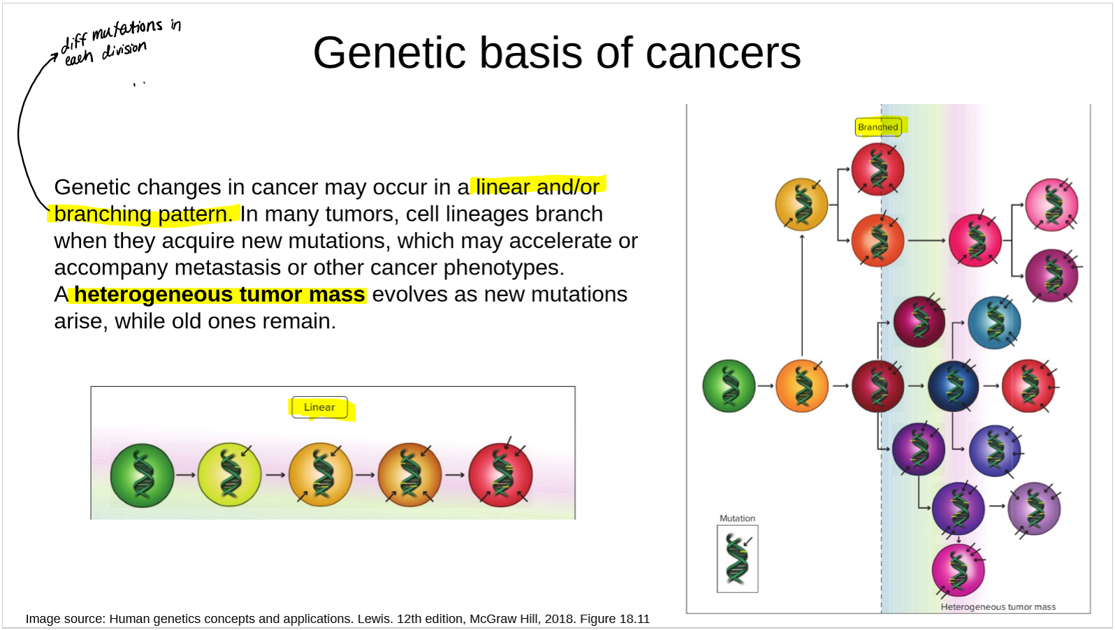 Genetic changes in cancer may occur in a linear and/or branching pattern.