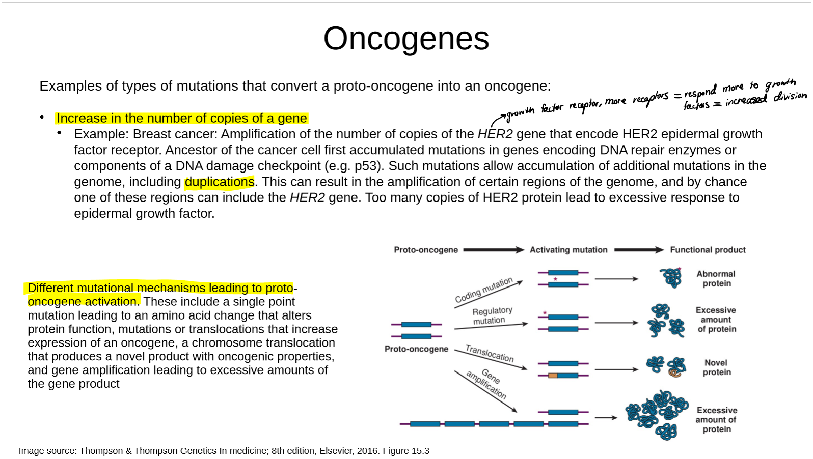 Proto-oncogenes often encode proteins needed for cell-cycle progression; oncogenic mutation increases gene expression or enhances the gene product’s efficiency (faster cell cycle progression).