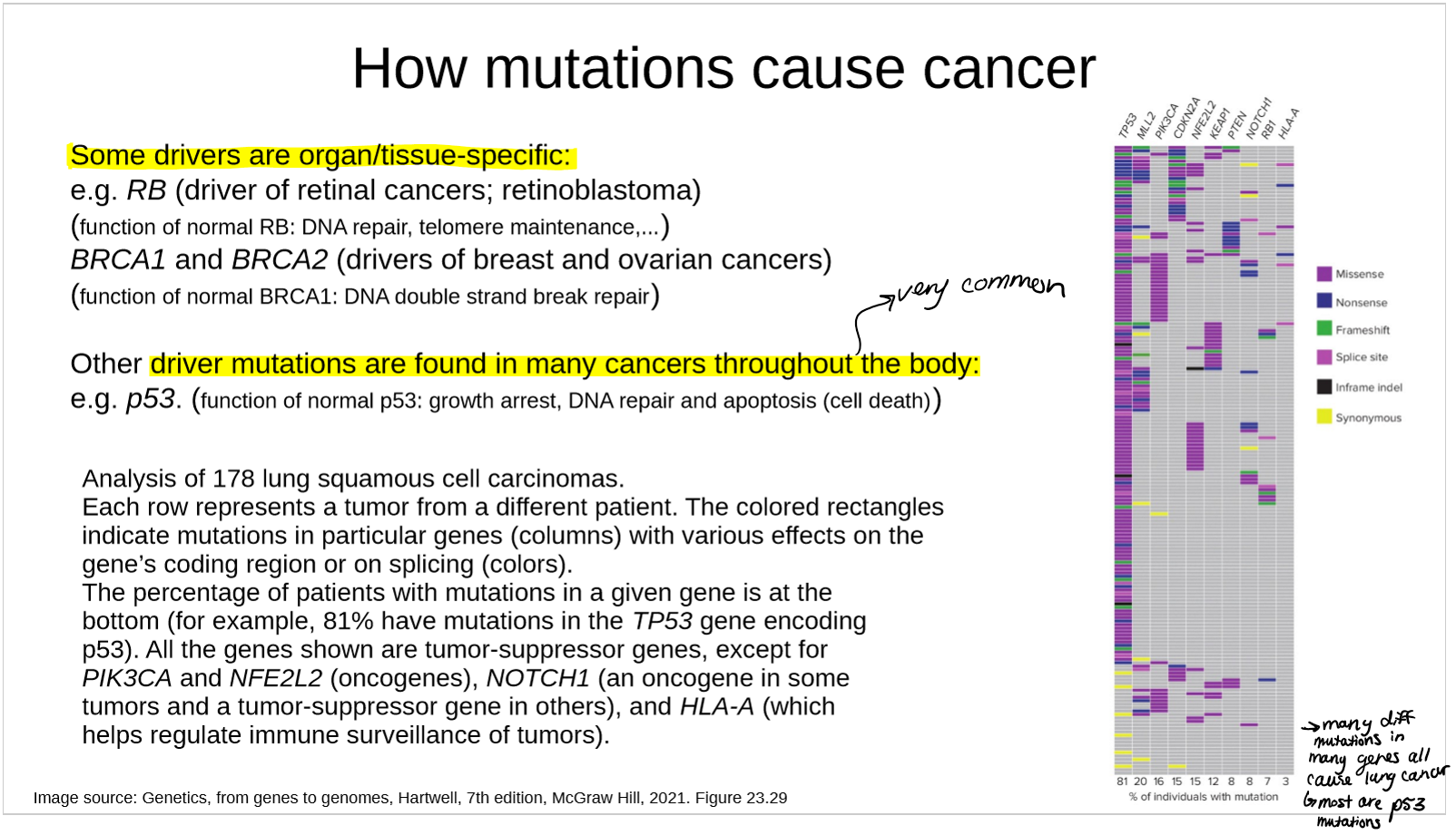 ● example: colon cancer cells have thousands of mutations not found in normal cells of the same person. 60-70 of these change open reading frames of genes. Of these 3-10 are likely to be driver mutations.
