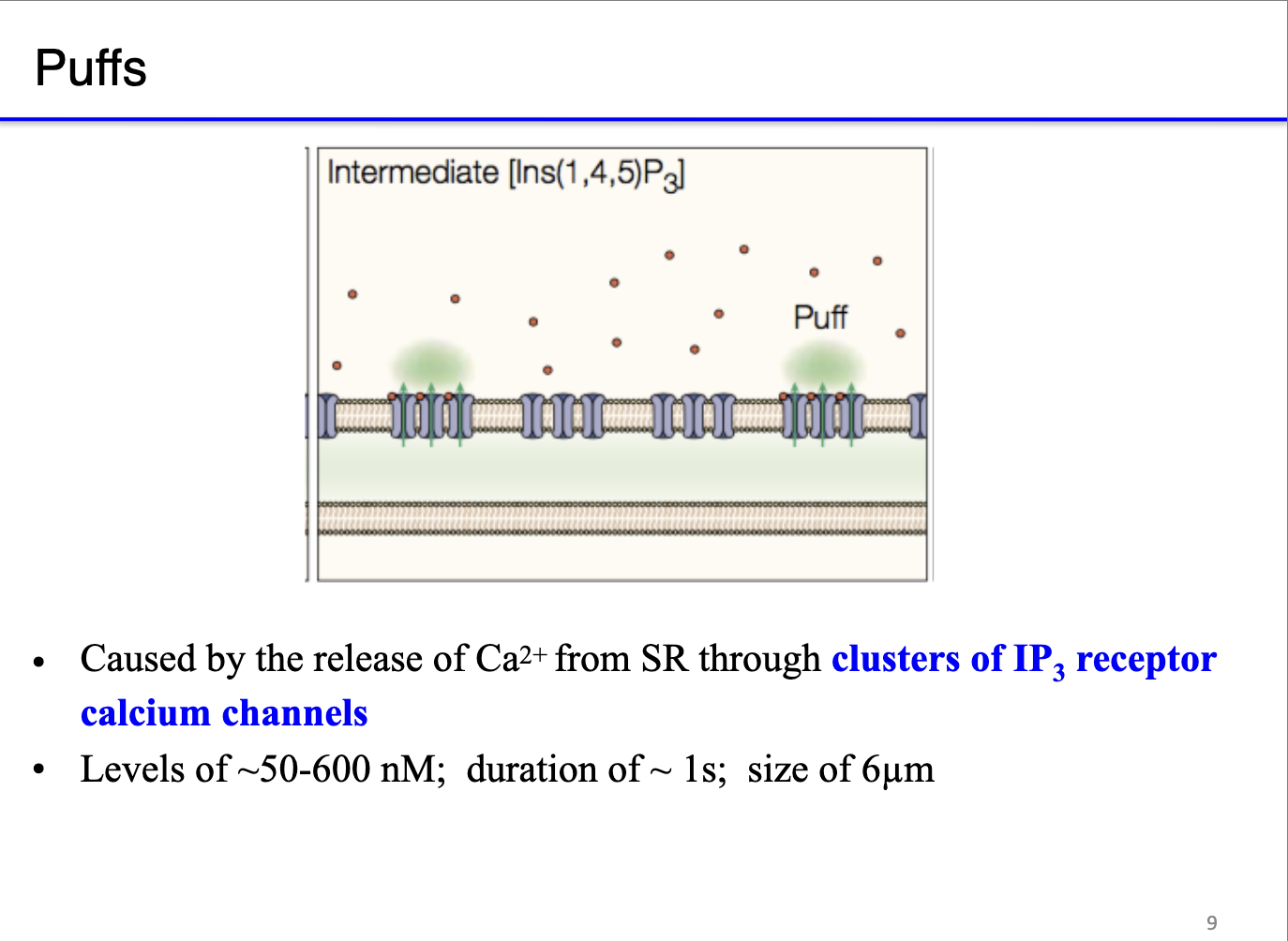 Puffs: larger, clustered releases from multiple IP3 receptors.