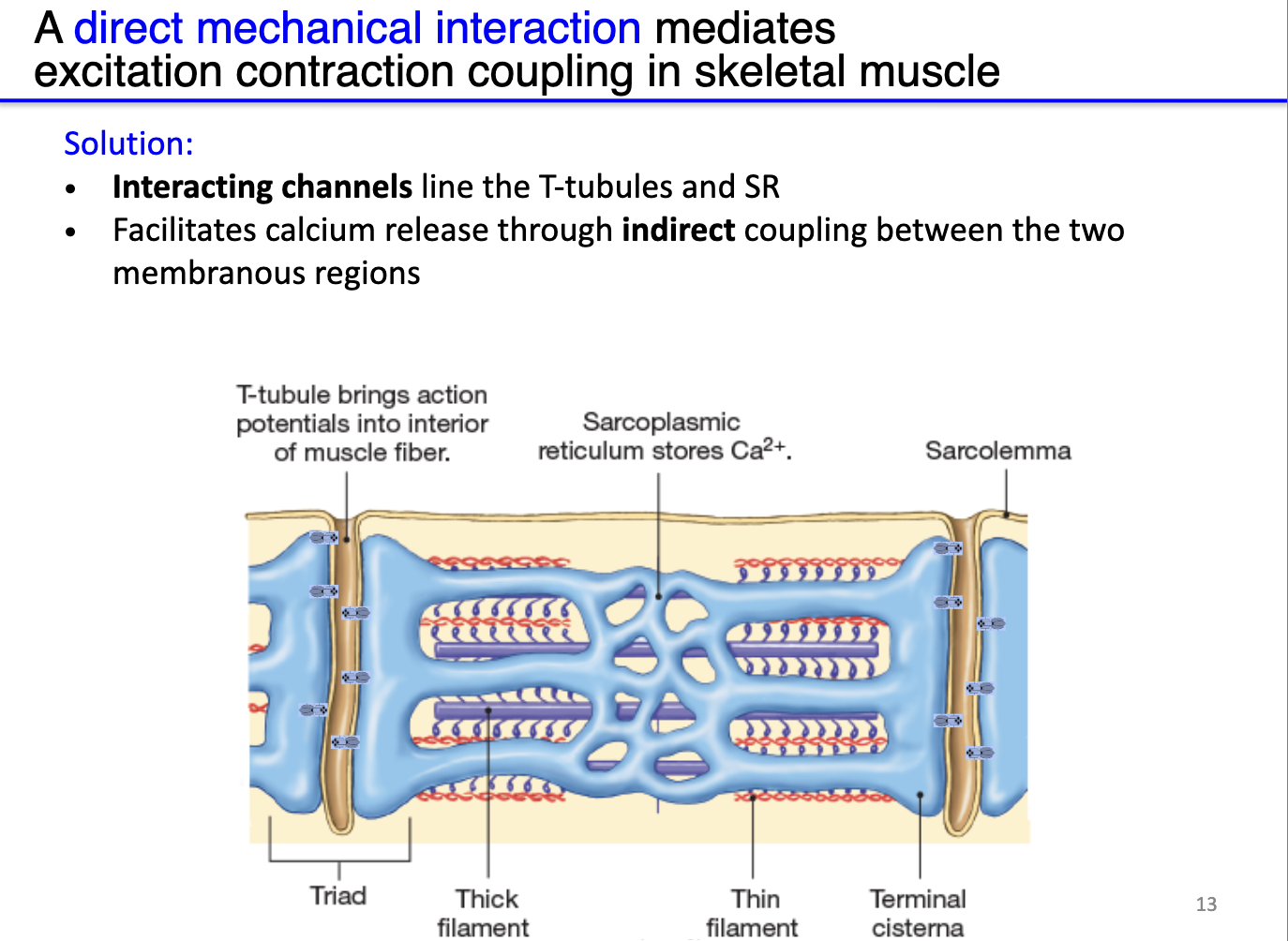 Indirect coupling: At rest, DHPR physically blocks RyR; T-tubule depolarization triggers conformational change in DHPR, opening RyR → Ca²⁺ release from SR.