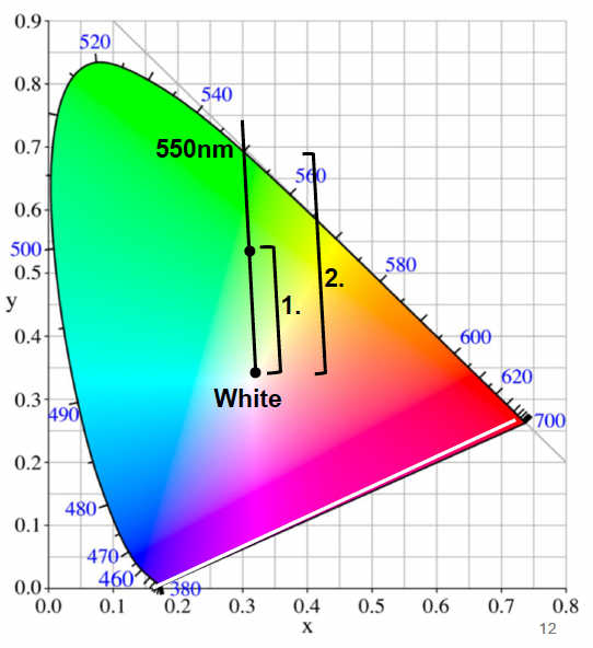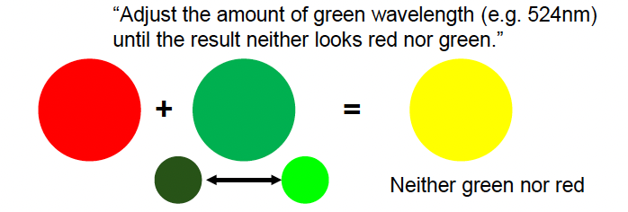 For example, pure red is obtained by cancelling the yellow in 700nm light with blue.