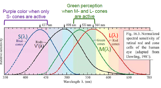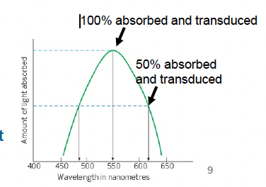 opsin+retinal within human photoreceptor can only absorb wavelength between 390nm -760nm