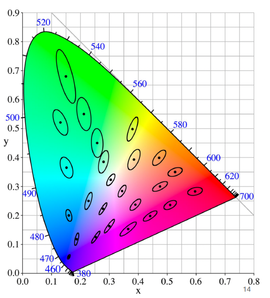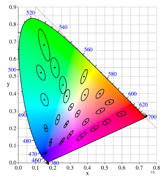 The MacAdam Ellipses are regions in the color space perceived to be the same color as the center.