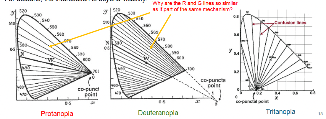 The CIE 1931 xy color space also indicates colors that appear the same to colorblind people.