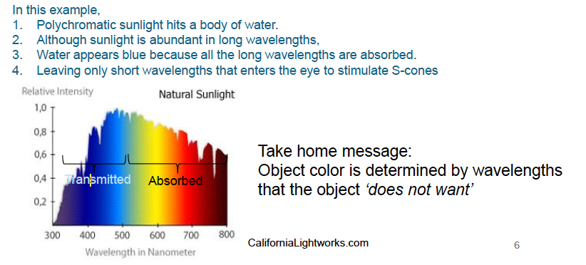 Only wavelengths that are either transmitted or reflected enter the eye to cause vision