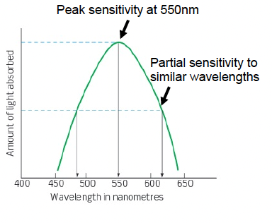 peak sensitivity of opsin at around 550nm (the most abundant wavelength on earth)