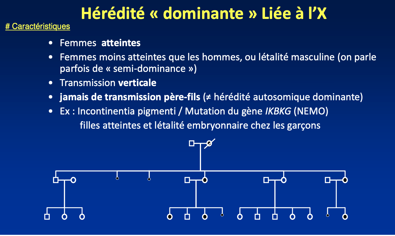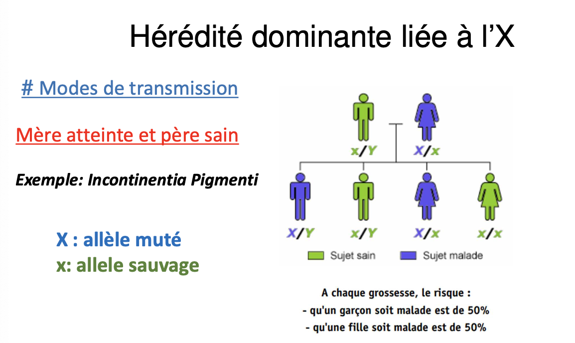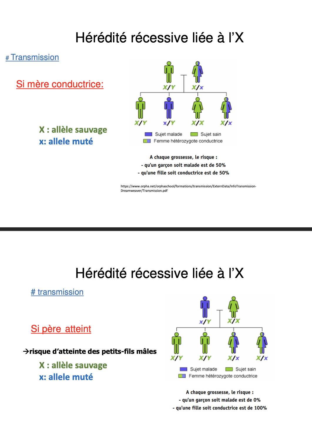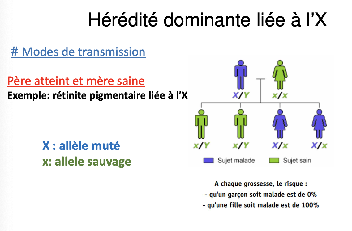 Hommes et femmes peuvent être atteints ; seules les femmes transmettent. Les hommes atteints ne transmettent jamais.