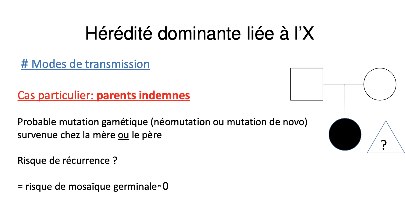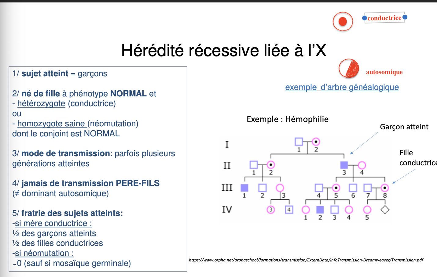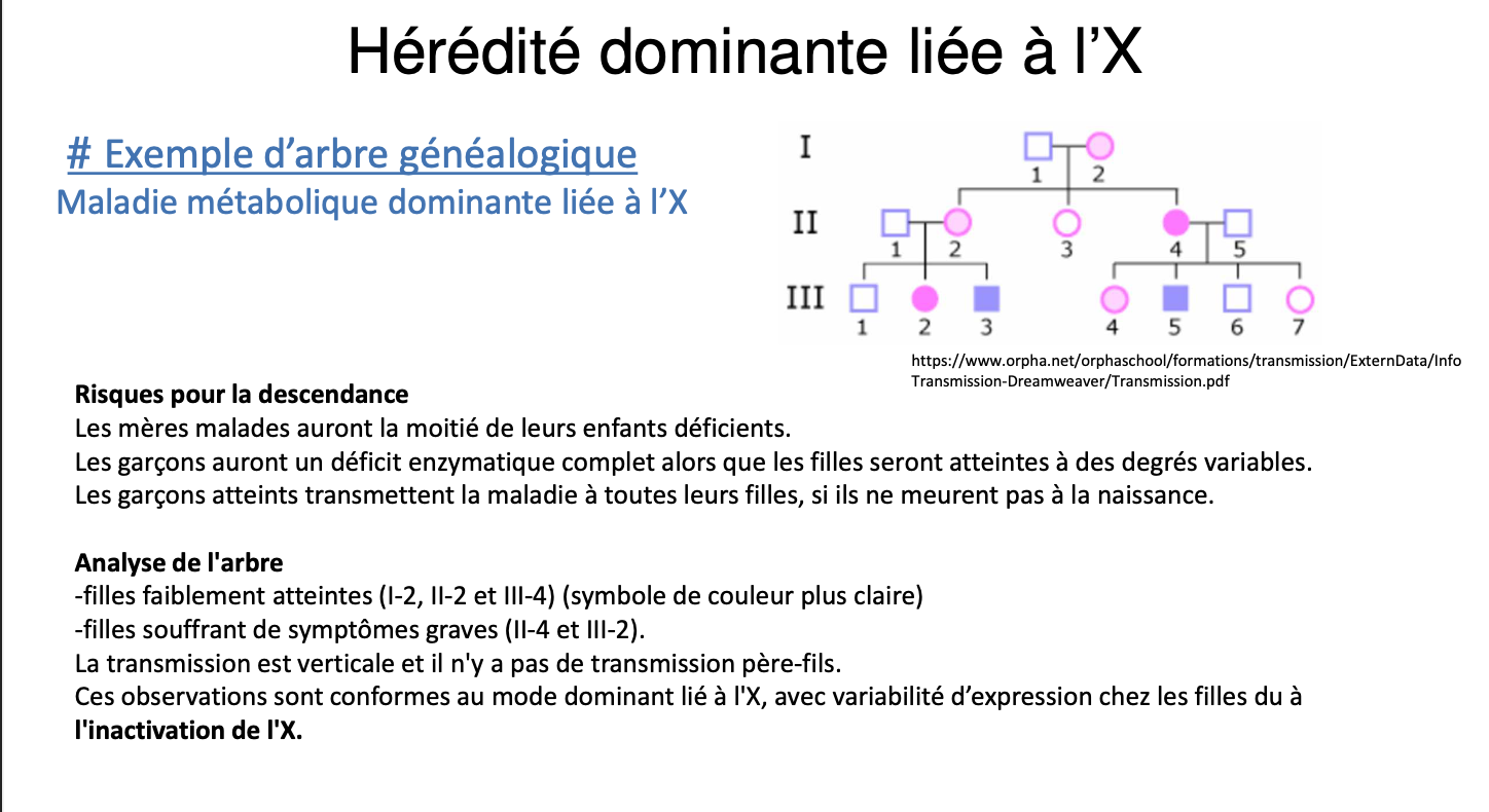 Hommes et femmes peuvent être atteints ; seules les femmes transmettent. Les hommes atteints ne transmettent jamais.