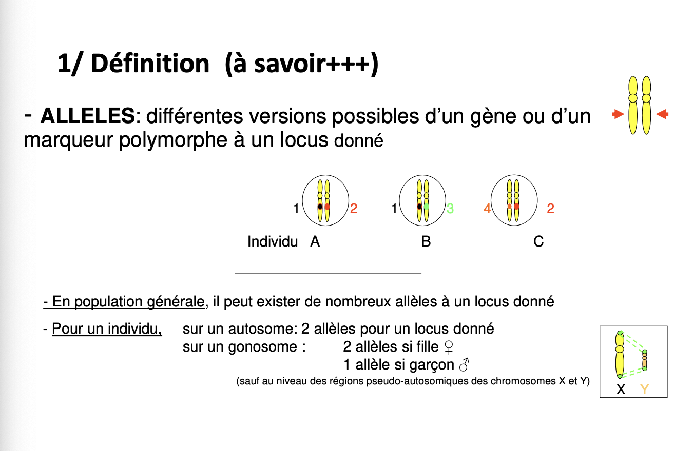 Allèles : versions alternatives d’un même gène ou marqueur, s’excluant mutuellement au moment de la méiose.