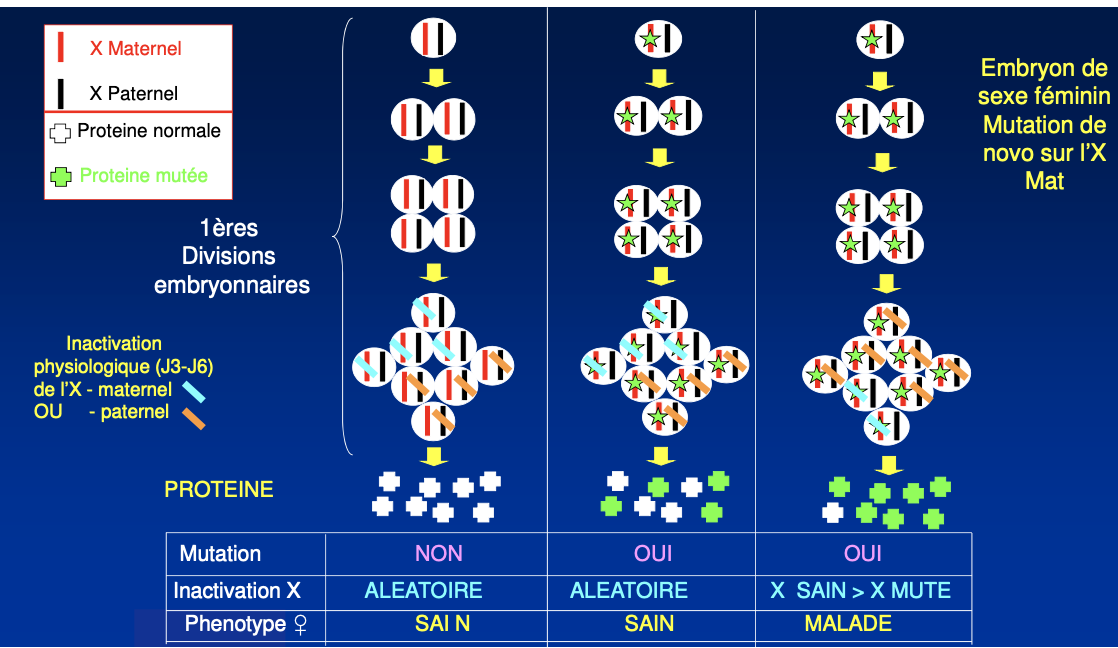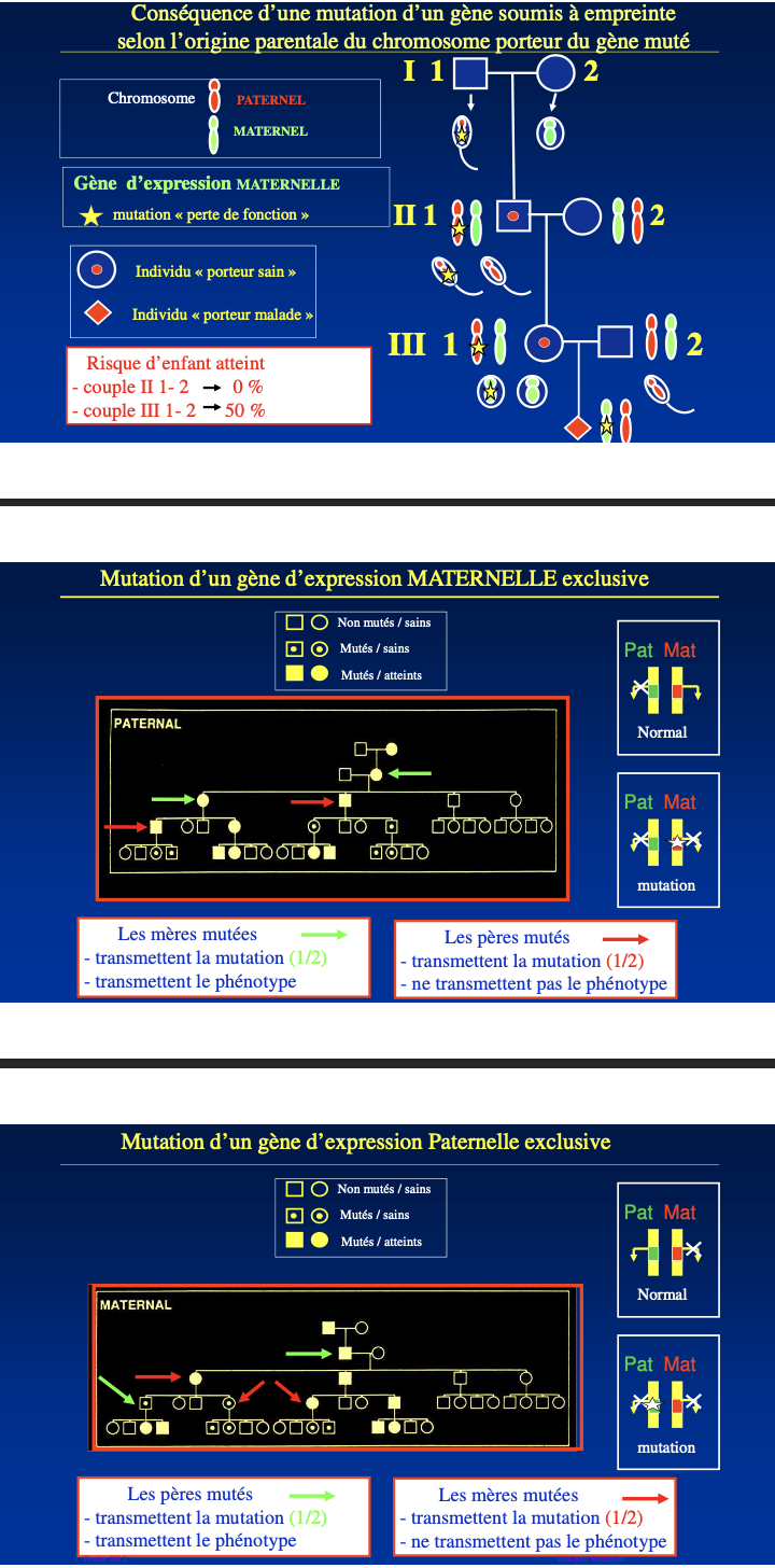 Mère mutée : transmet la mutation sans phénotype (allèle maternel silencé).