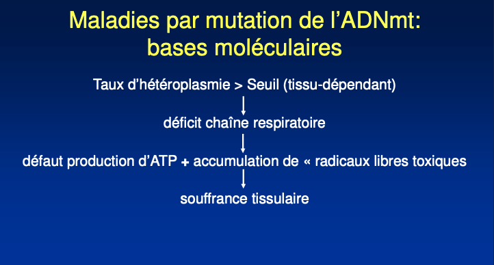 Le risque et la sévérité augmentent avec le taux d’hétéroplasmie ; expression si un seuil tissulaire est dépassé.