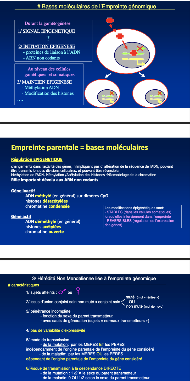 Hérédité non mendélienne : pénétrance incomplète, variabilité d’expressivité, et surtout dépendance au sexe du parent transmetteur. On observe des sauts de génération apparents lorsque la mutation est transmise par le parent dont l’allèle est normalement silencé.