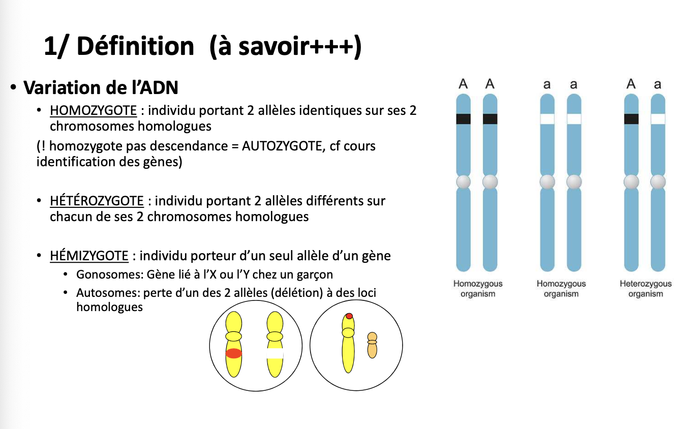 Hémizygote : un seul allèle pour un gène (ex. gène lié à X chez un garçon, ou perte d’un allèle par délétion).