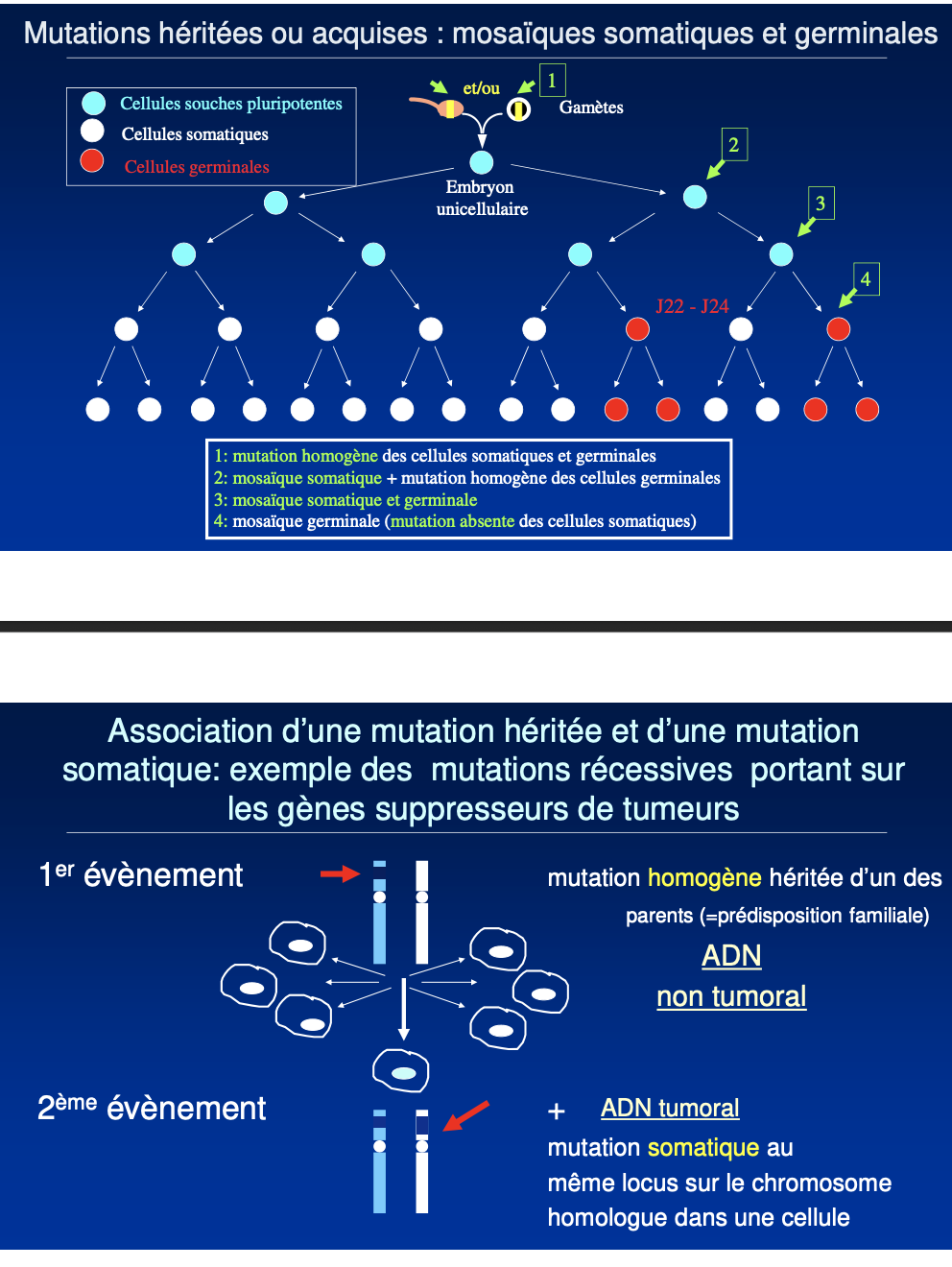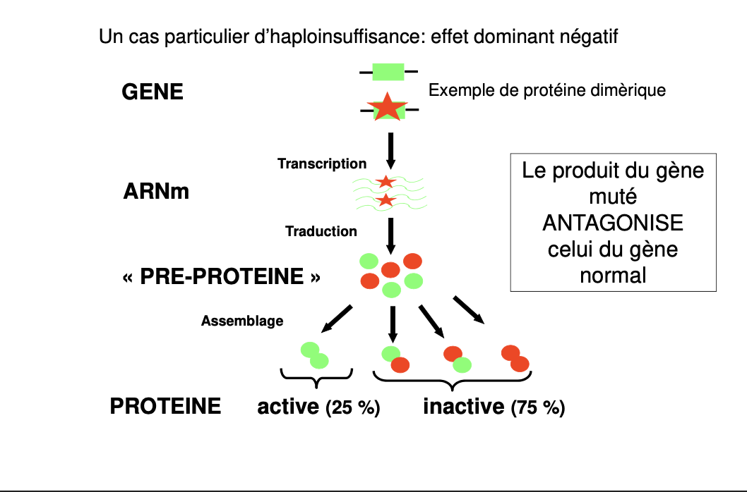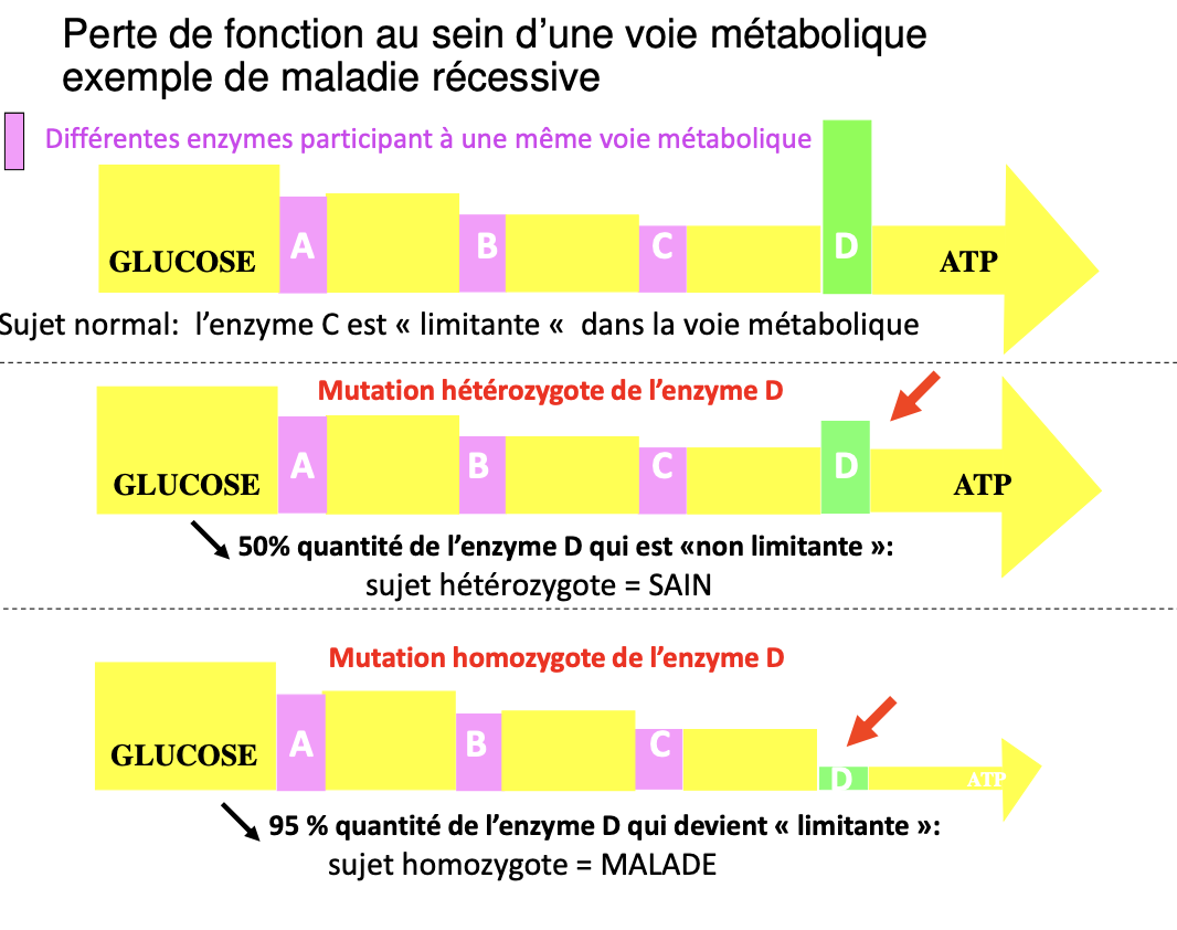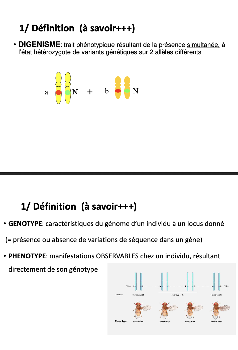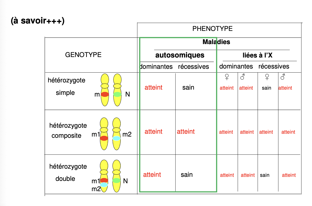Exemple : un individu présente une mutation a sur un gène d’un chromosome, et une mutation b sur un autre gène → leur combinaison produit un phénotype pathologique.