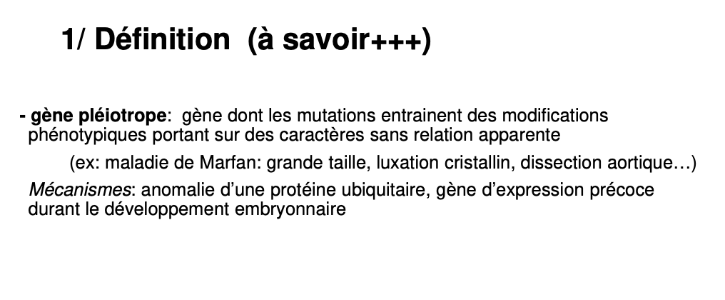 Syndrome de Marfan (mutation du gène FBN1) → entraîne : grande taille, luxation du cristallin, fragilité de l’aorte (dissection).