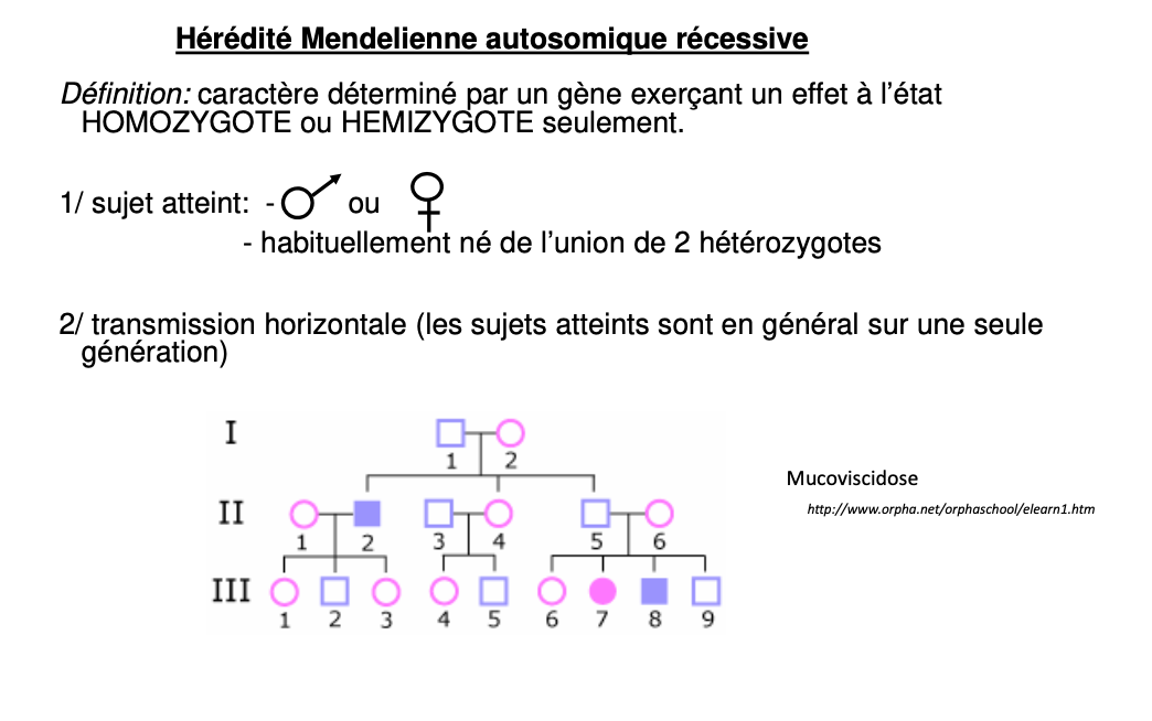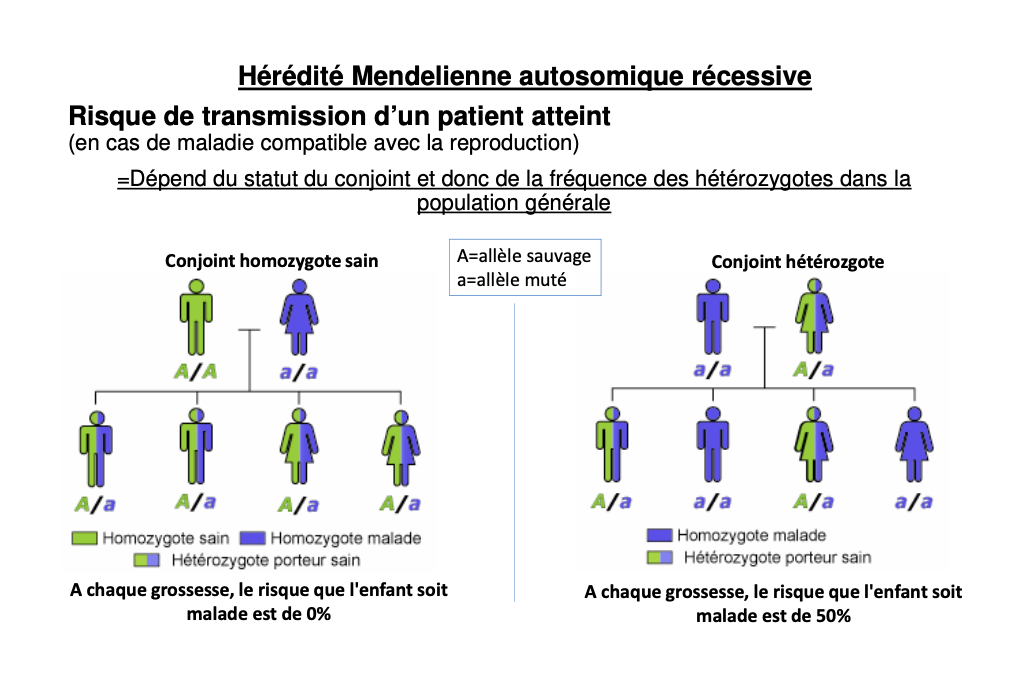 Gène sur un autosome ; la maladie s’exprime quand on porte deux allèles mutés (aa) (ou hémizygote par délétion).