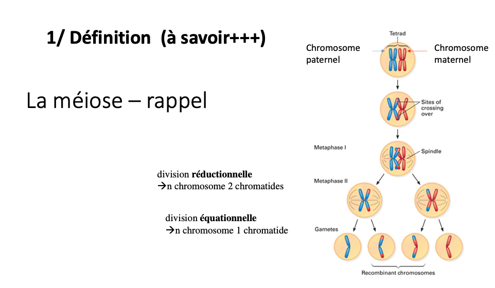 Méiose I (division réductionnelle) : séparation des chromosomes homologues → produit deux cellules avec n chromosomes, chacun à 2 chromatides.