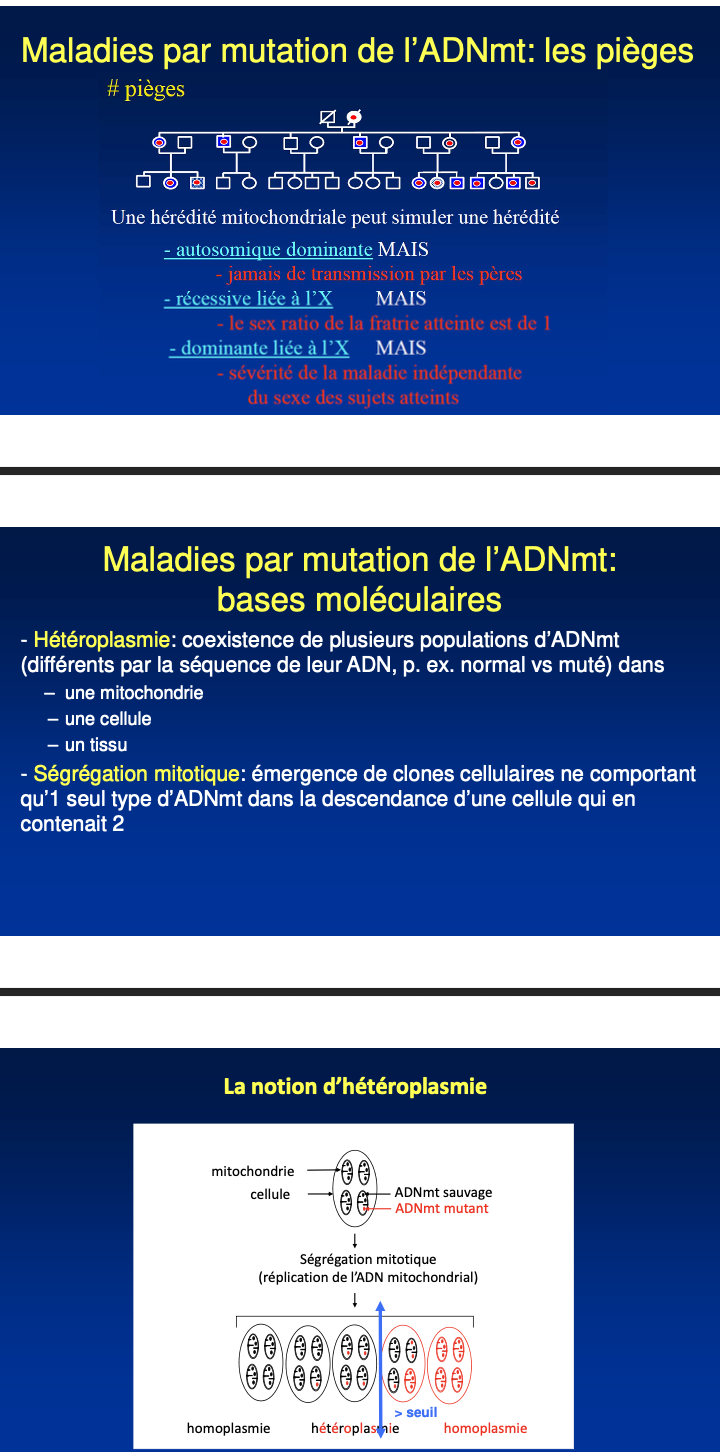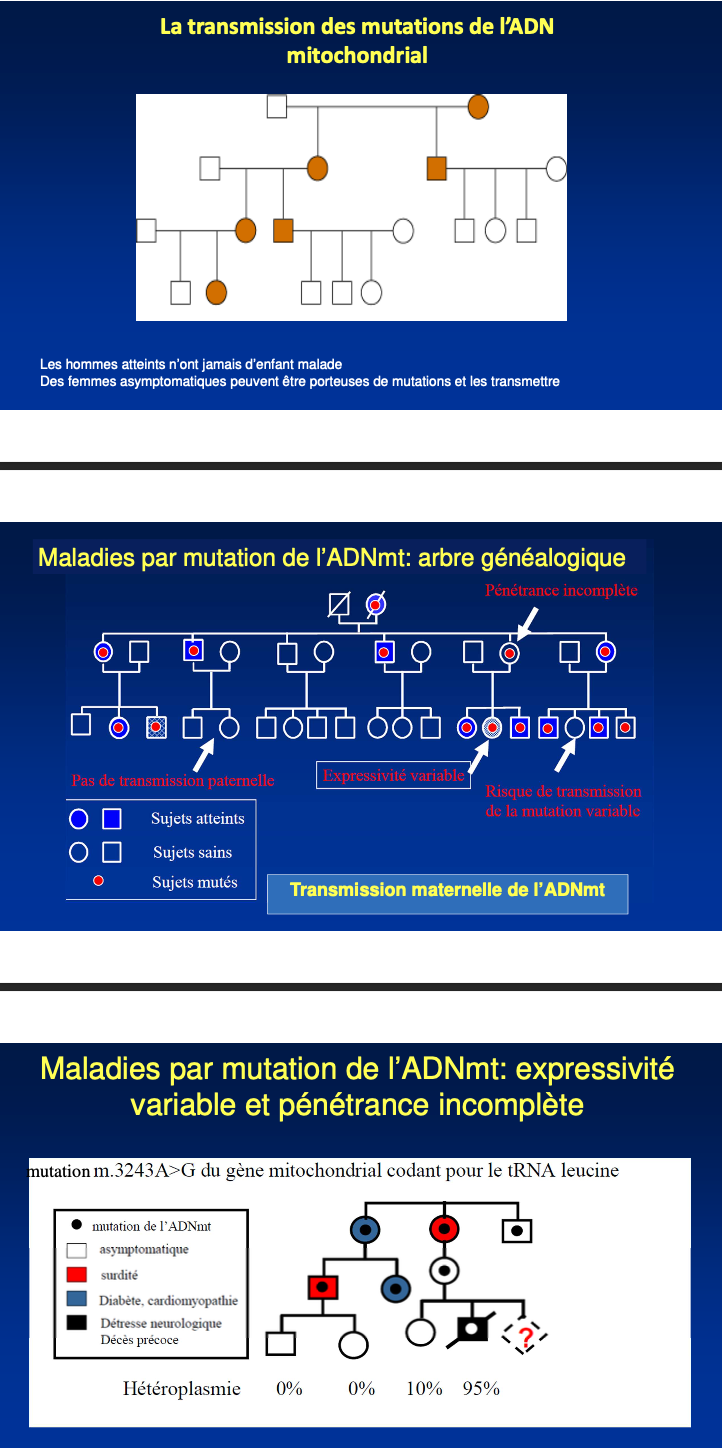 À cause de l’hétéroplasmie et de la pénétrance incomplète : elles peuvent être porteuses sans symptômes mais transmettre des charges mutées plus élevées.