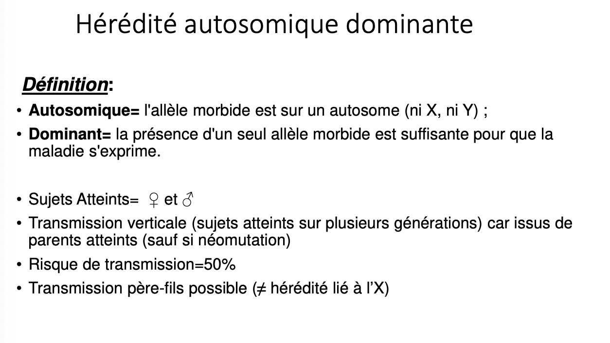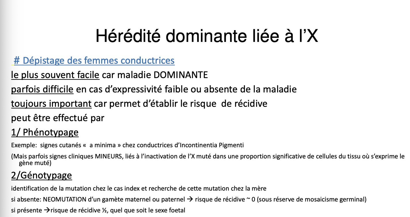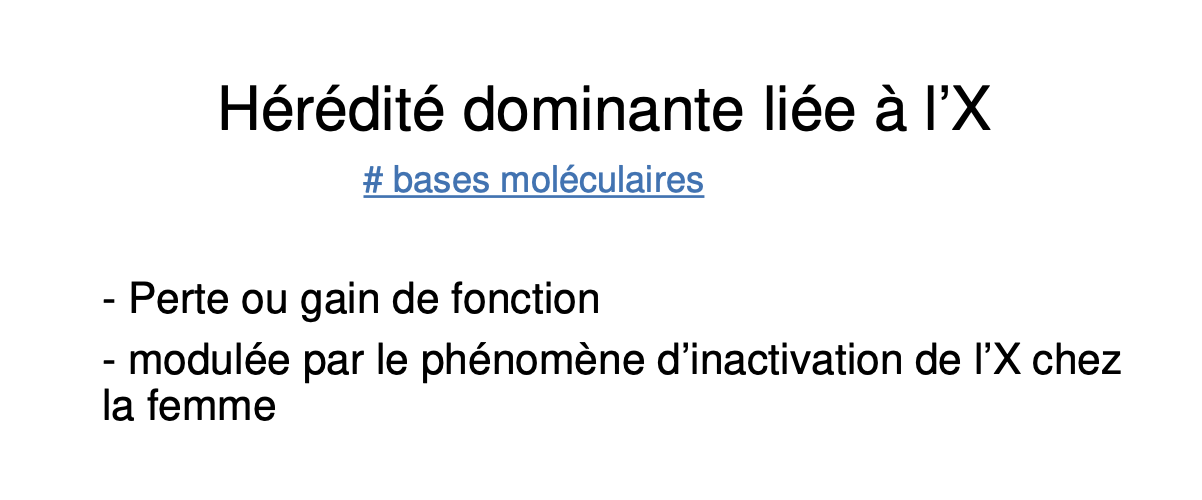 Mimique autosomique dominante (atteints sur plusieurs générations) mais : jamais de transmission par les pères.