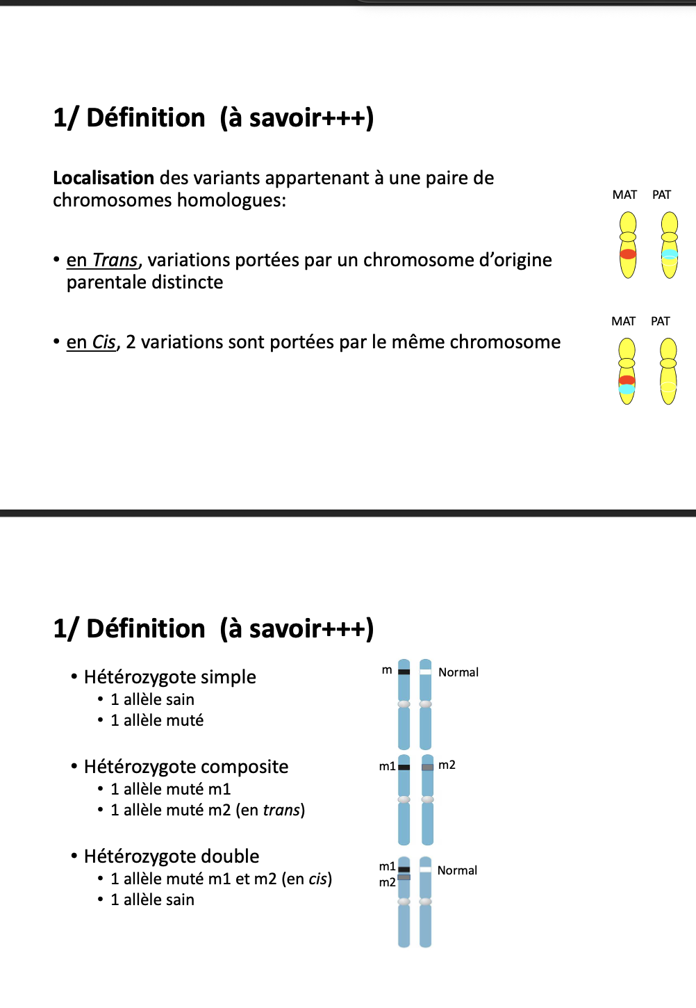 En trans : chaque variant est porté par un chromosome d’origine parentale différente (ex. mutation maternelle sur un chromosome, mutation paternelle sur l’autre).