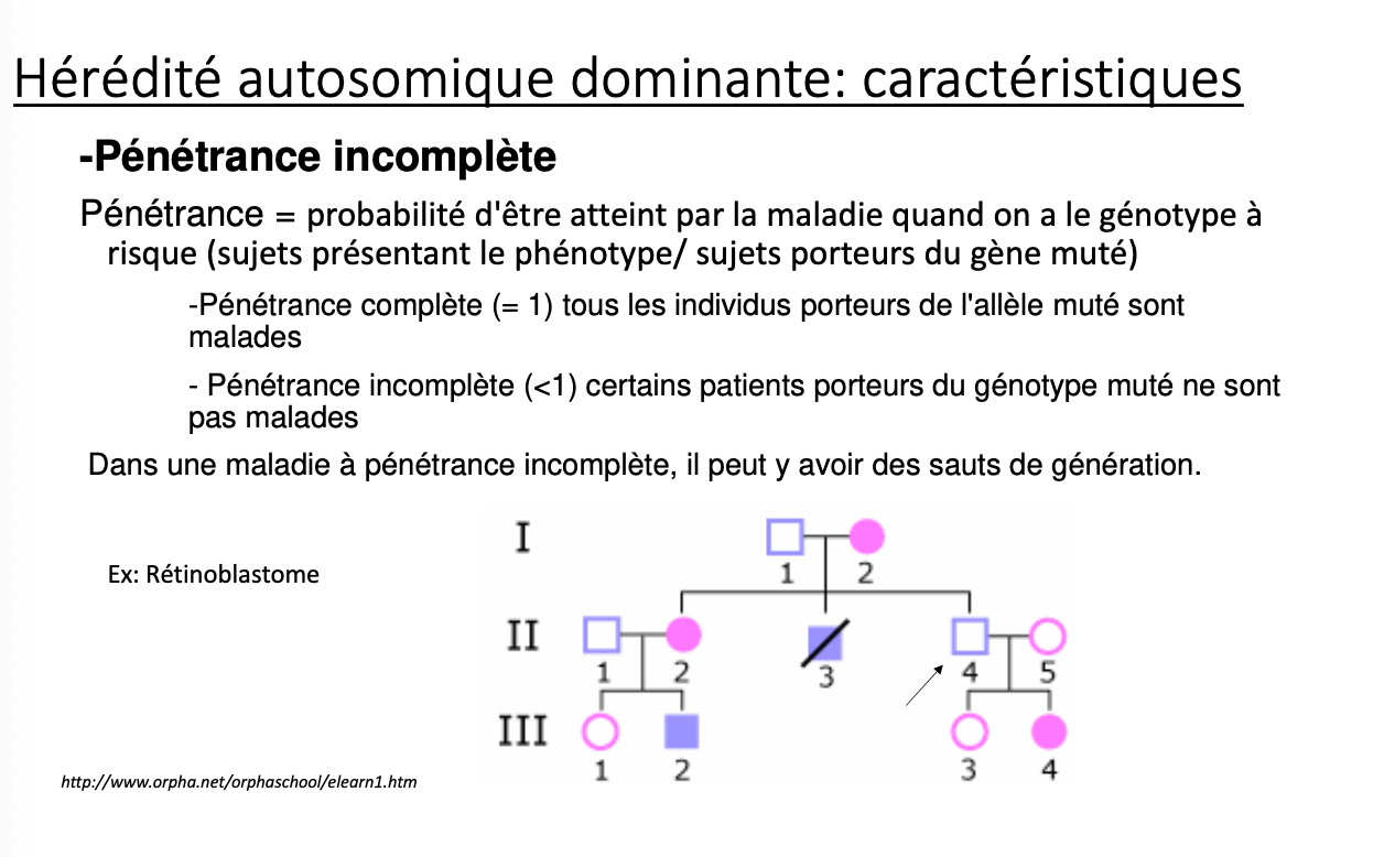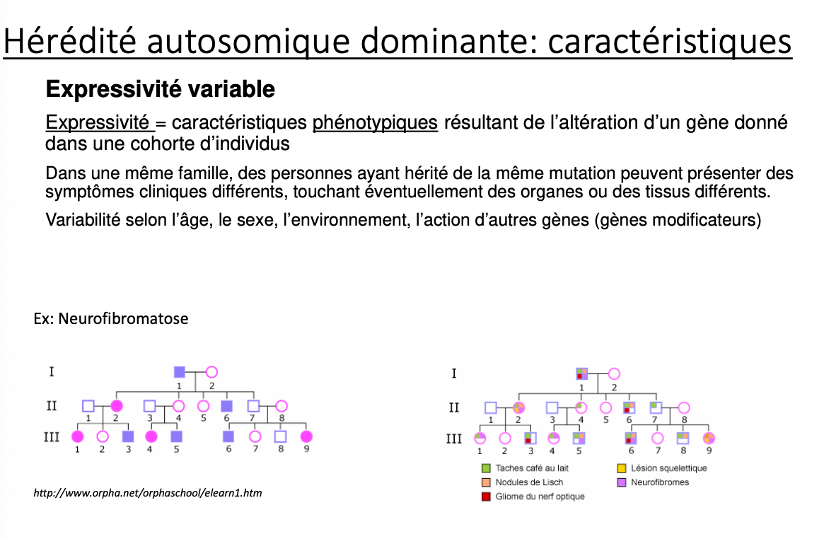 Expressivité variable : intensité des symptômes différente selon les sujets ; pénétrance incomplète : certains porteurs ne présentent aucun symptôme.