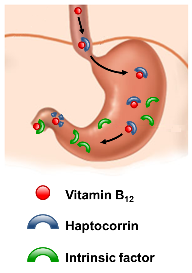 What are the 2 mechanisms of vit B12 absorption and how do they occur?