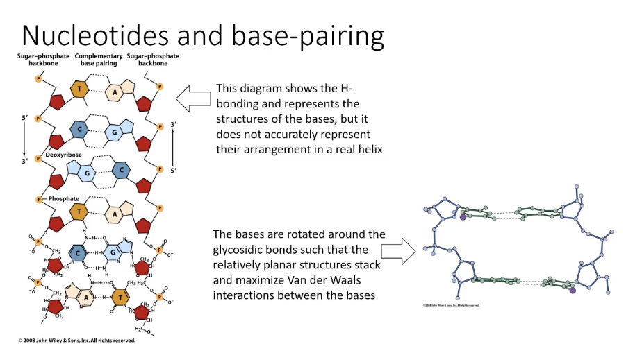 This diagram shows the H-bonding and represents the structures of the bases, but it does not accurately represent their arrangement in a real helix