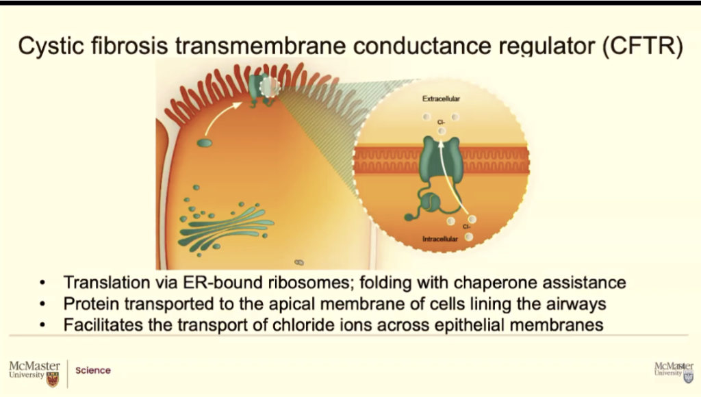 It codes for a protein and this gene gets transcribed and translation and becomes a importatn protein that goes through the endoplasmic reticulum and ends up at the top of those epithelial cells (like right beside those finger-like projections)