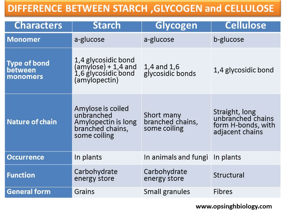 Starch stores energy in plants, glycogen stores energy in animals, and cellulose provides support in plant cell walls