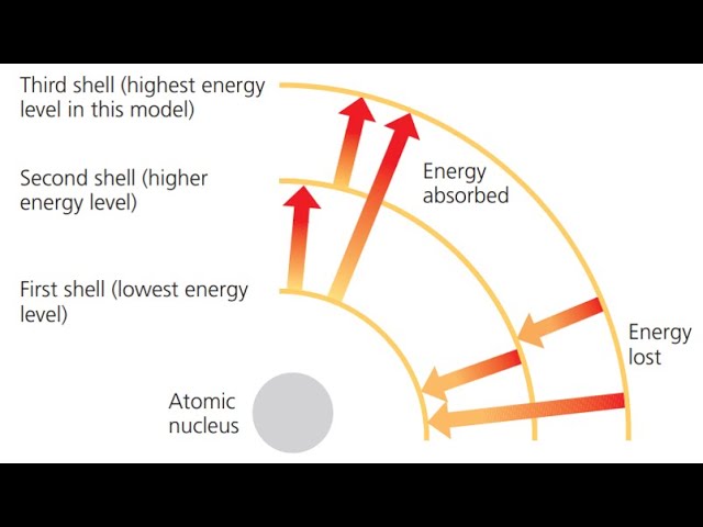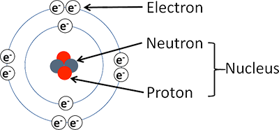 Electrons (neg. charge) orbit the nucleus, which is made up of protons (pos. charge) and neutrons (no charge). They donāt orbit randomly, but at a certain level from the nucleus called an electron shell.