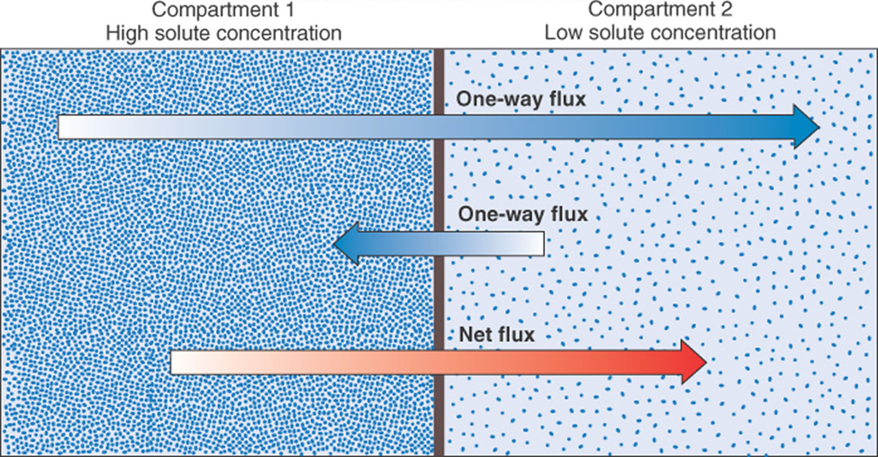 Passive diffusion occurs down a concentration gradient, and net flux takes into account diffusion in both directions