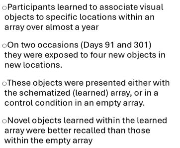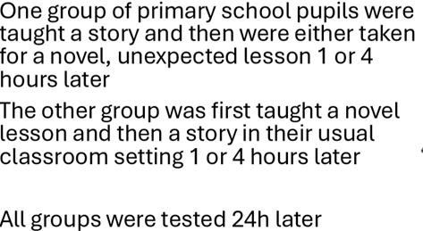 Ballarini et al tested novelty and memory in children, these were the two conditions as well as a control condition which involved no novelty – what was the effect of these unrelated novel experiences on children’s memory