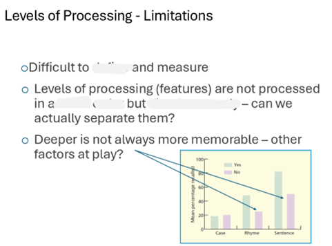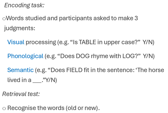 visual processing is shallow, phonological is intermediate and semantic processing is the deepest and most memorable