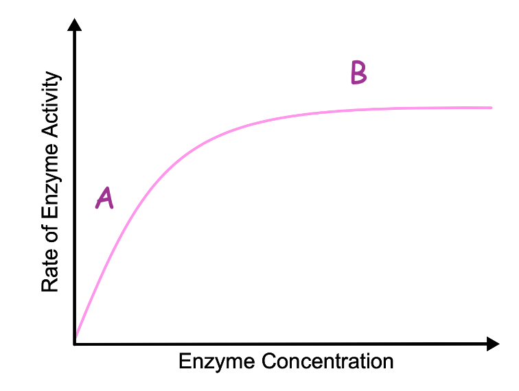The graph shows the effect of enzyme concentration on the rate of enzyme activity. Describe and explain what is happening at B