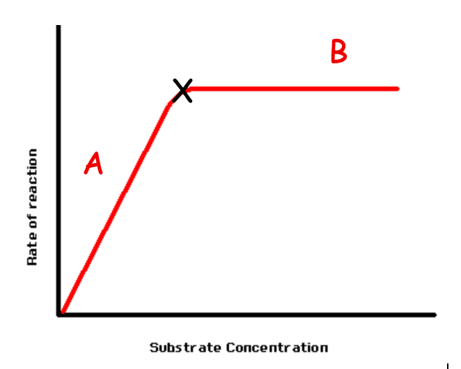 The graph shows the effect of substrate concentration on the rate of enzyme activity. Describe and explain what is happening at A