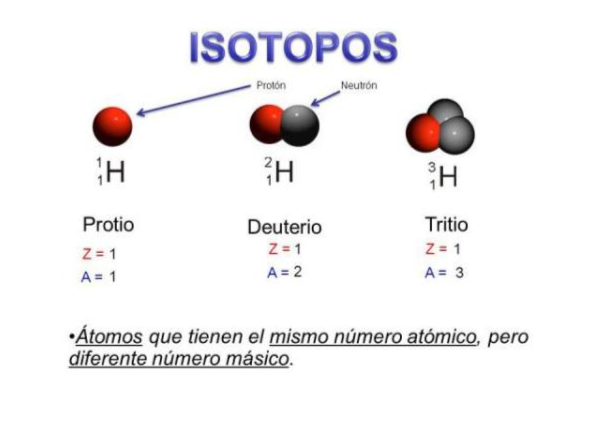 Atomos del mismo elemento con igual numero atómico (igual numero de electrones de que protones) pero tienen diferente numero de masa porque tienen diferente numero de neutrones.