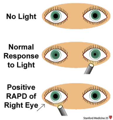 the affected eye will dilate when light is shone into it, because signals cannot reach the brain - ONLY works when doing swinging flashlight test
